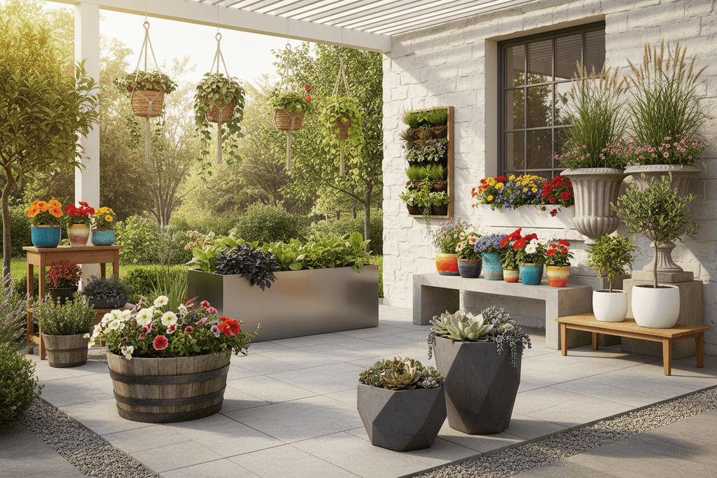Place large urn-style planters at important spots in your garden or along pathways. Fill them with lush greenery or seasonal flowers to create vibrant visual anchors.